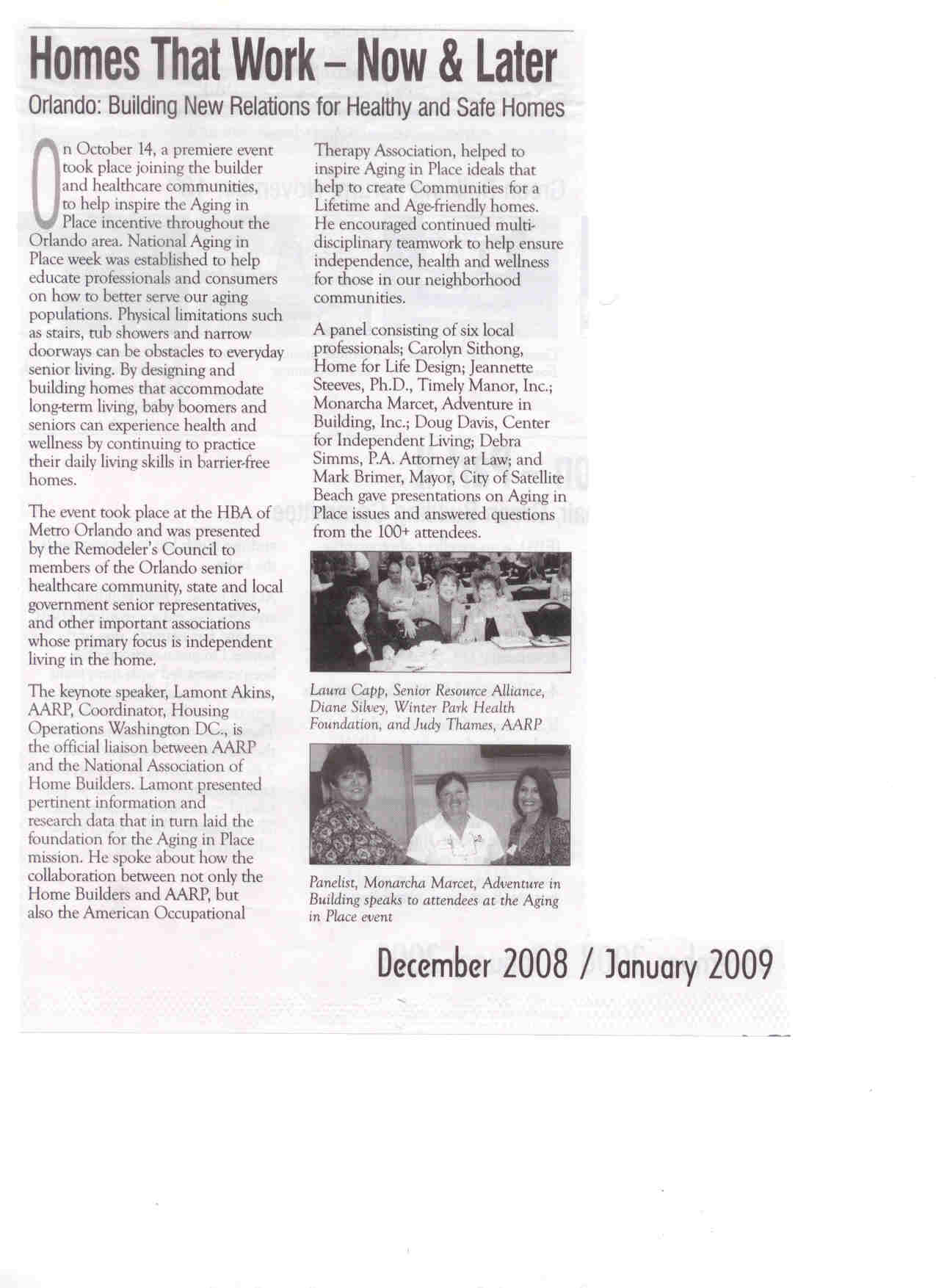 Monarcha Marcet participated as a panelist in a discussion on Aging in Place on October 14. This successful event was co-hosted by the National Aging in Place Council (local chapter) and the HBA of Metro Orlando Remodeler Council.HBA News December 2008 January 2009