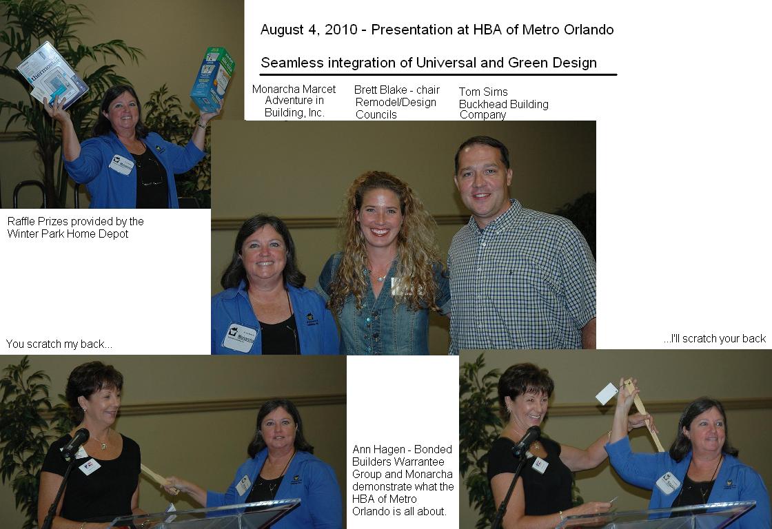 HBA Remodel/Design Council MeetingOn August 4, 2010 Monarcha Marcet spoke at the Home Builder's Association of Metro Orlando on the subject of Universal Design. (see photo)___________________________________